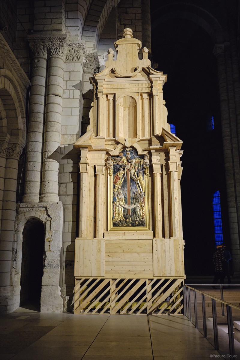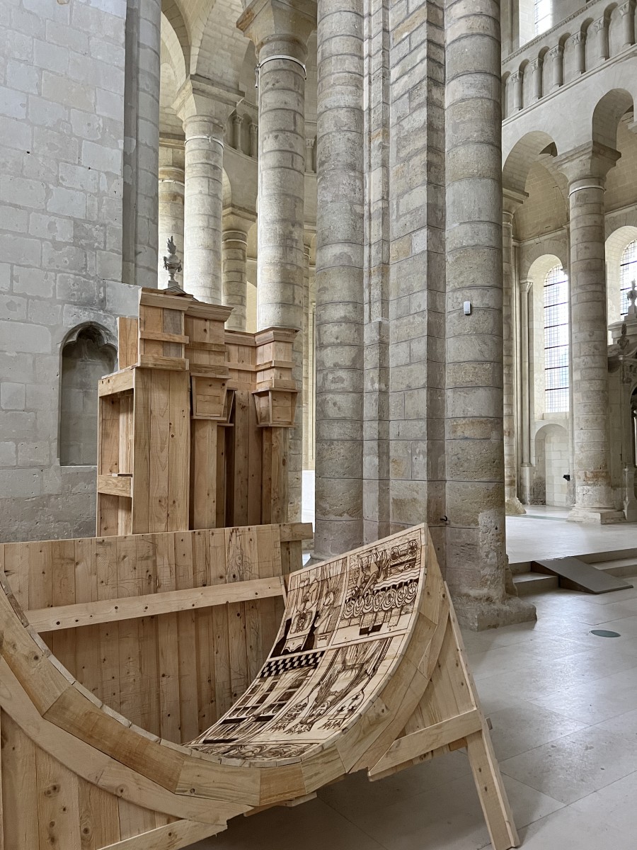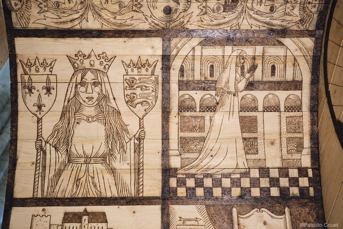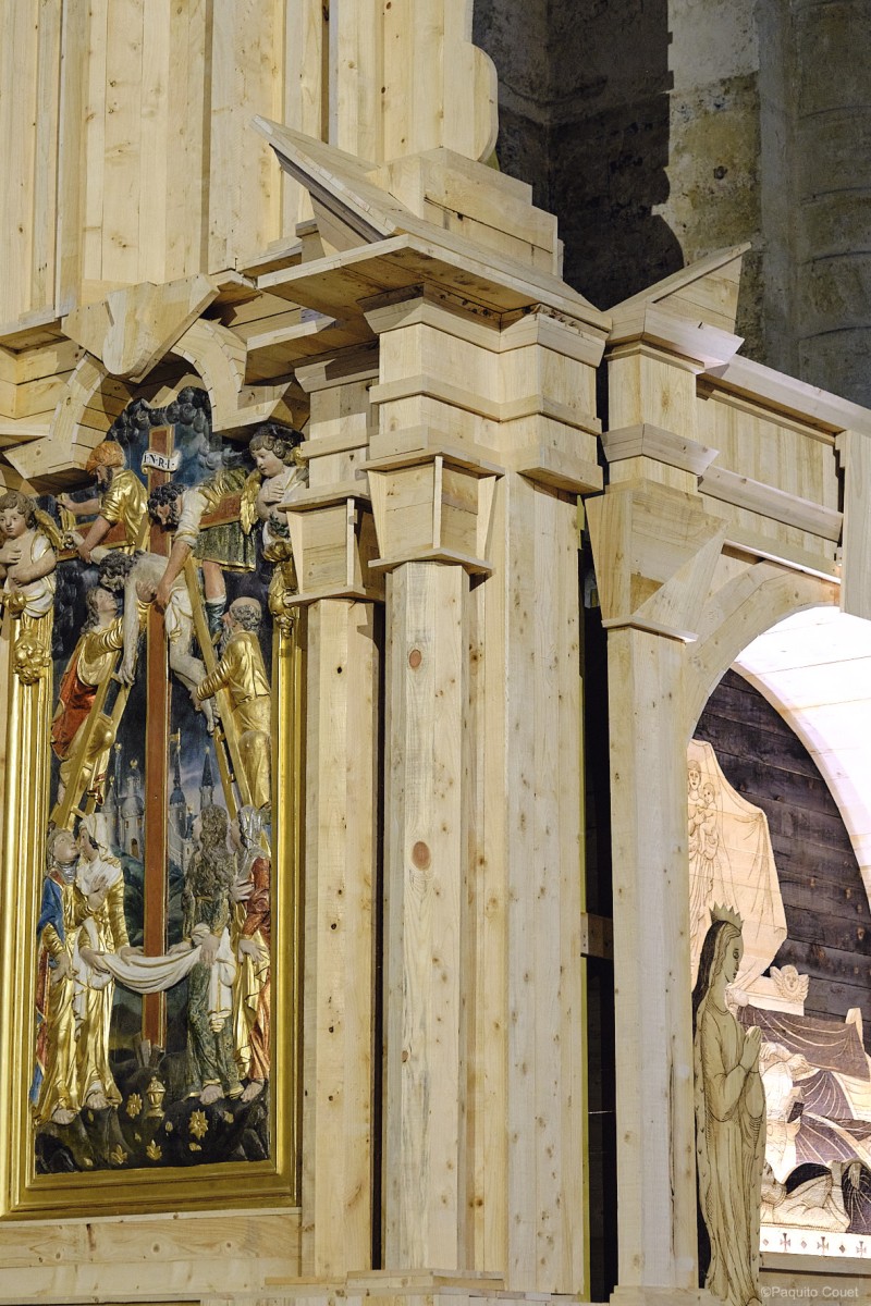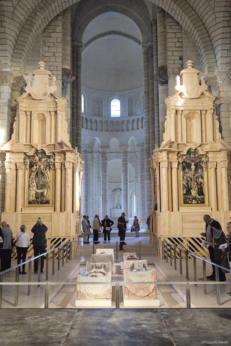 A l’occasion des 900 ans d’Aliénor d’Aquitaine, l’Abbaye Royale de Fontevraud organise l’exposition «Le Cimetière des Rois» et profite de l’occasion pour réinvestir la nef de l’église abbatiale et offrir aux visiteurs une tentative de restitution du Tombeau des Rois tel qu’il était au 17e siècle. Aujourd’hui subsistent de ce monument 2 retables ainsi que 2 hauts reliefs situés dans les chapelles voisines. L’objectif était donc de recréer ces deux retables dans leurs dimensions d'origine et d’y ré-installer les deux hauts reliefs originaux mais également d’apporter une médiation complémentaire et une expérience de visite unique à travers la la réalisation d'un récit graphique entièrement pyrogravé retraçant l'histoire d’Aliénor d’Aquitaine. La construction a nécessité 4 tonnes de cyprès de Bretagne qui ont été levée à la main dans l'église.