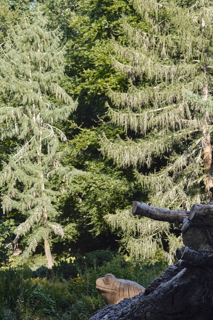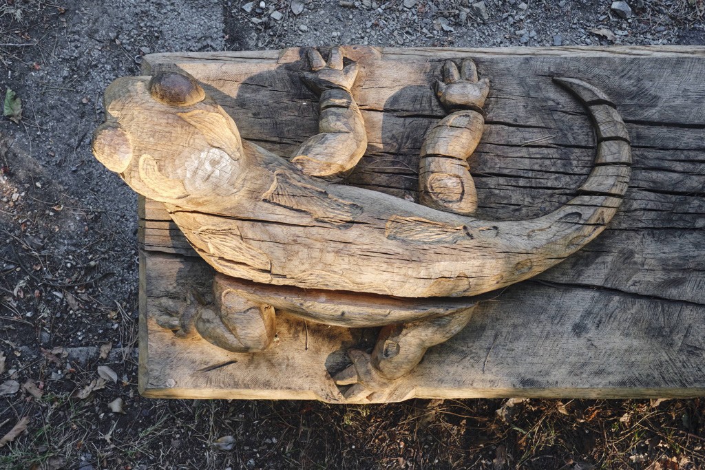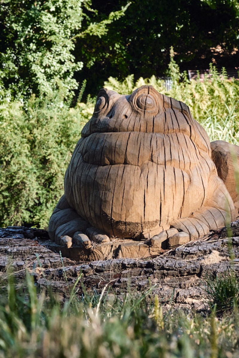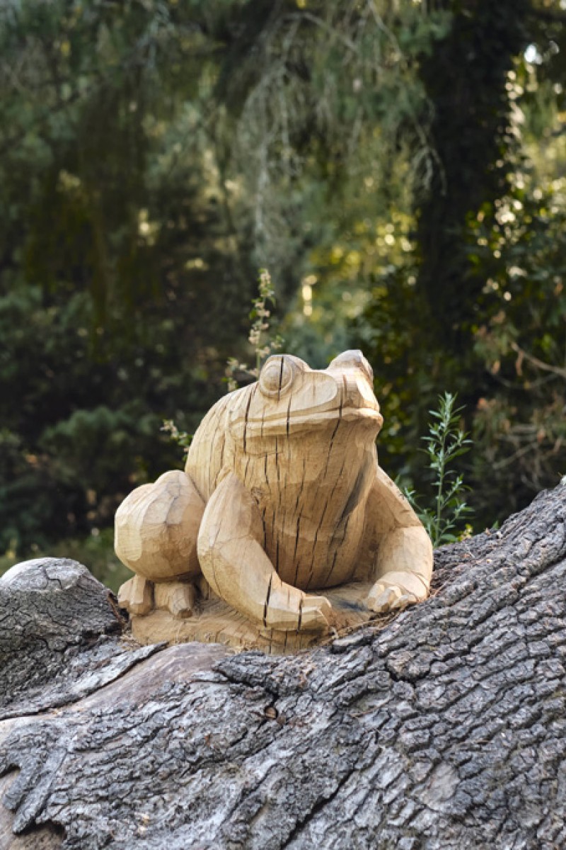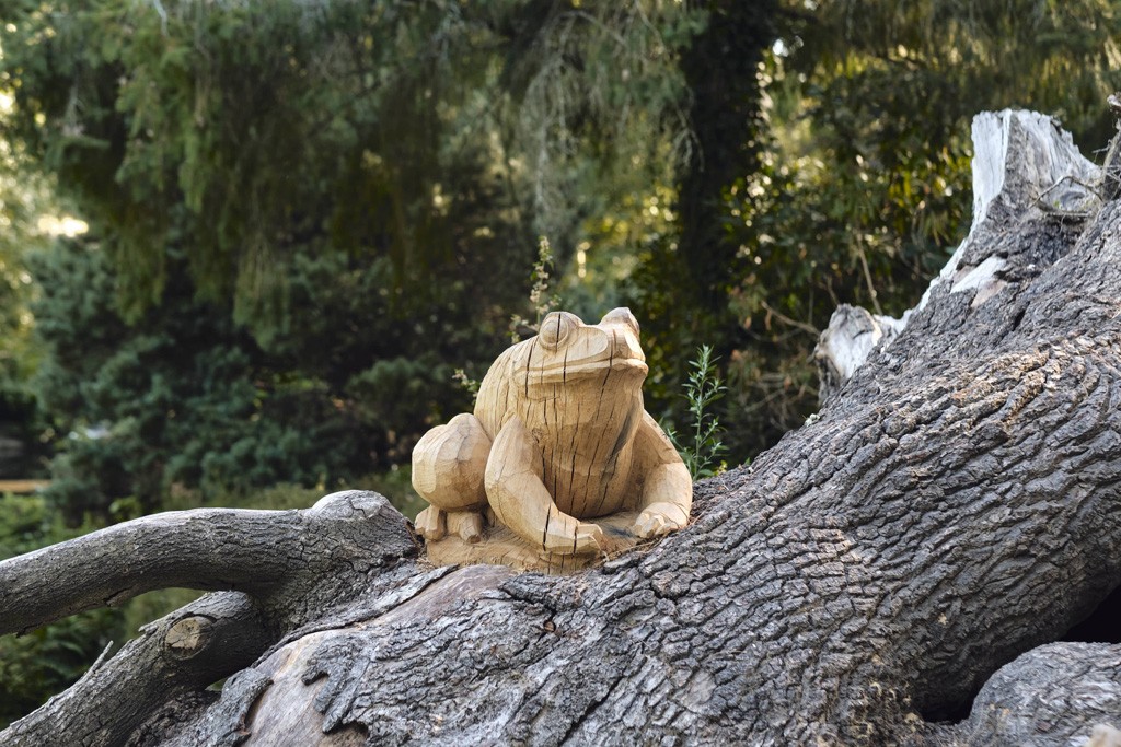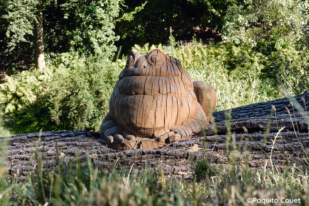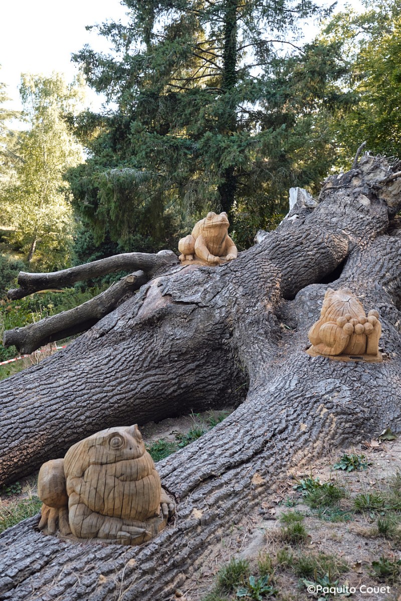 - Un trio de crapauds alyte accoucheurs sculptés dans un tronc de chêne multi centenaire tombé en 2024 lors d’une tempête et resté en place dans le parc de la Gaudinière et une salamandre sur un banc face aux crapauds.