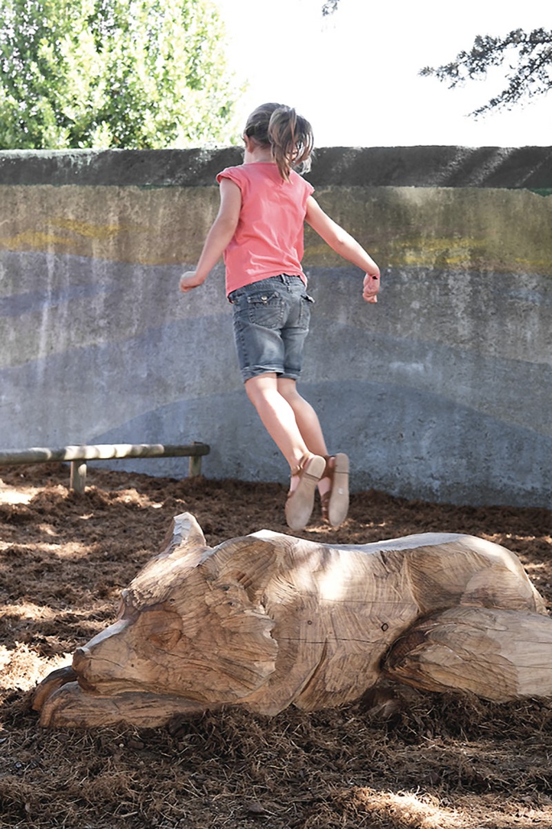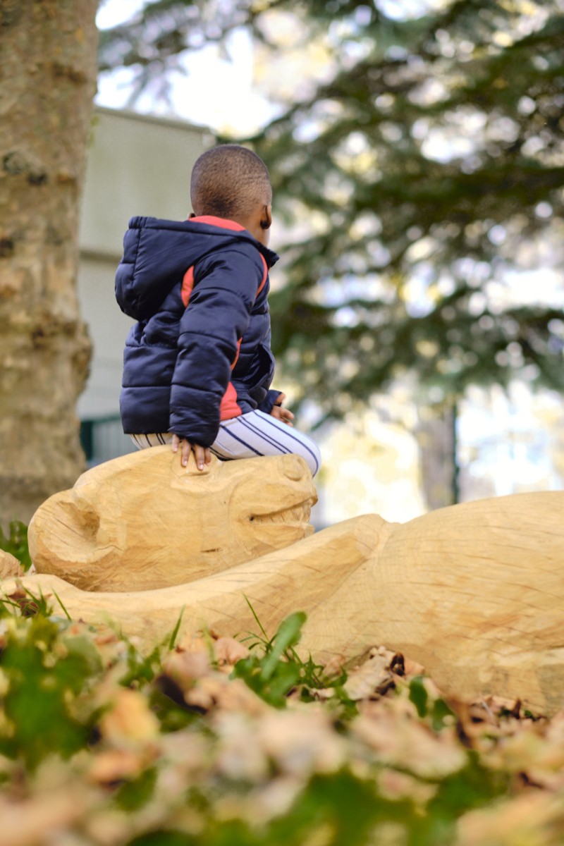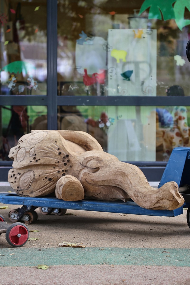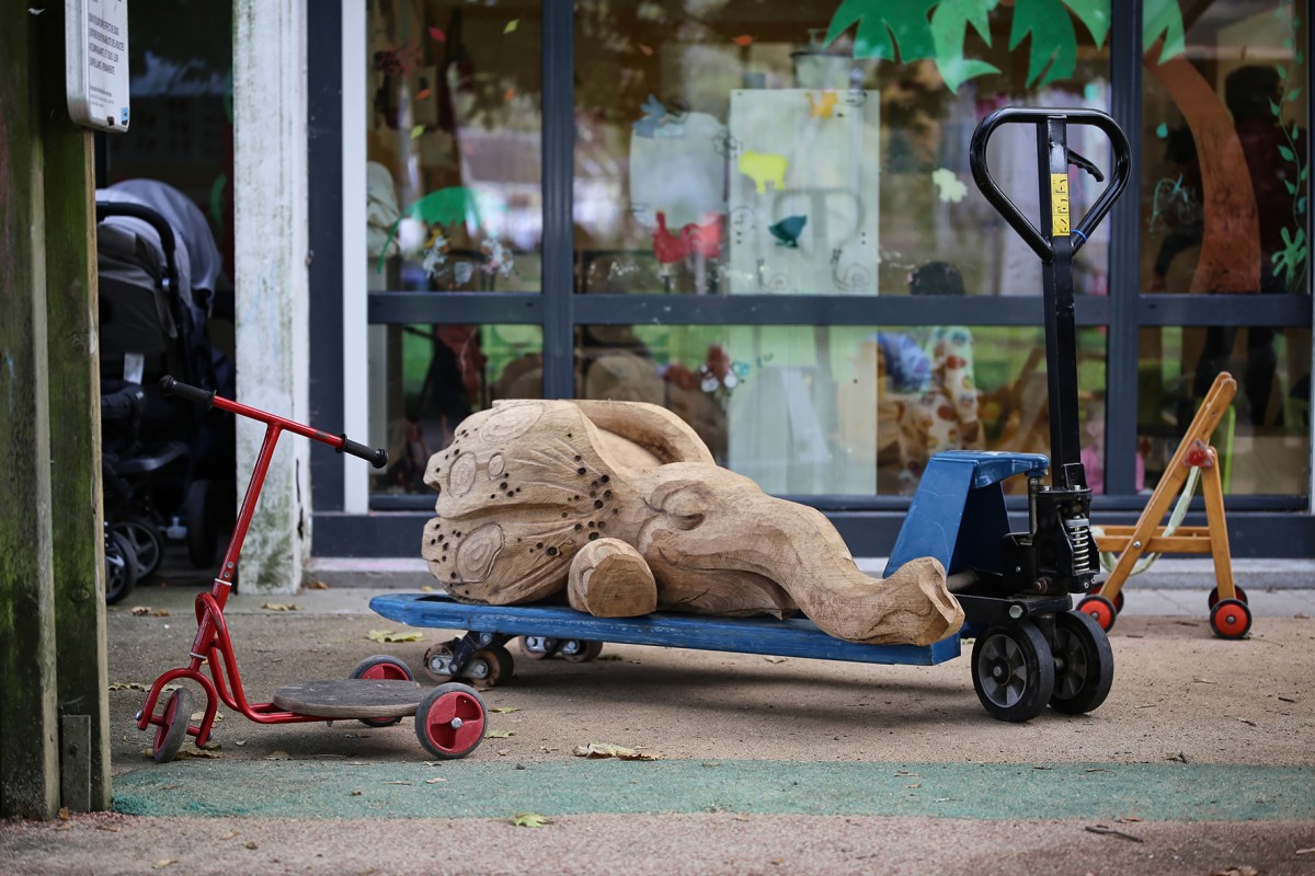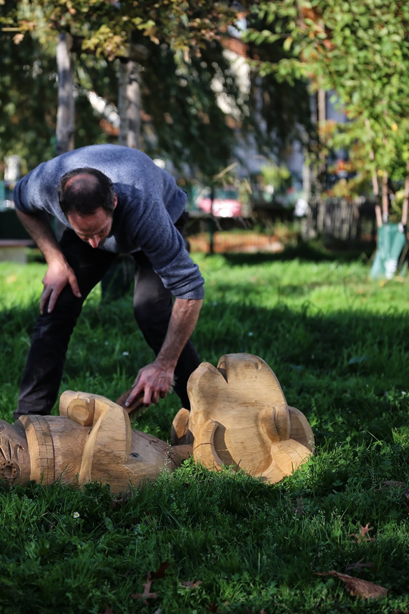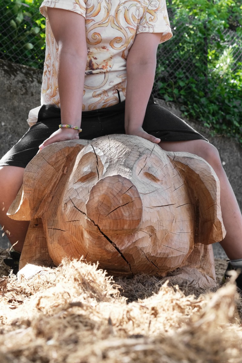 En 2022 l’école François Dallet a été notre premier terrain d’expérimentation, dans le cadre de la re-végétalisation de sa cour. À partir des troncs couchés, nous avons sculpté des animaux endormis choisis par les enfants, renard, castor, cochon, lapin, souris. Leur posture allongée prolonge naturellement la forme d’un tronc et instaure une présence massive et douce, à hauteur d’enfant. Supports de récits et de jeux, les élèves se les sont rapidement appropriés.