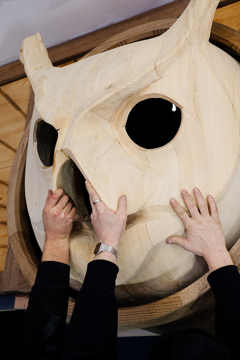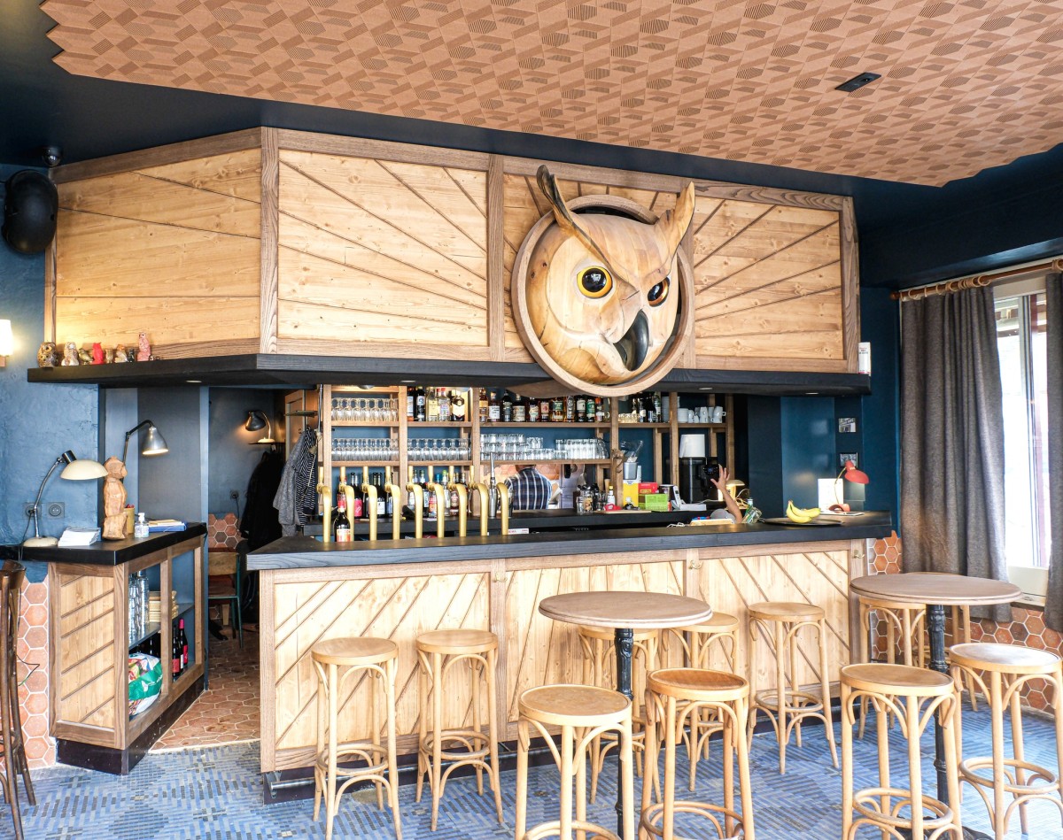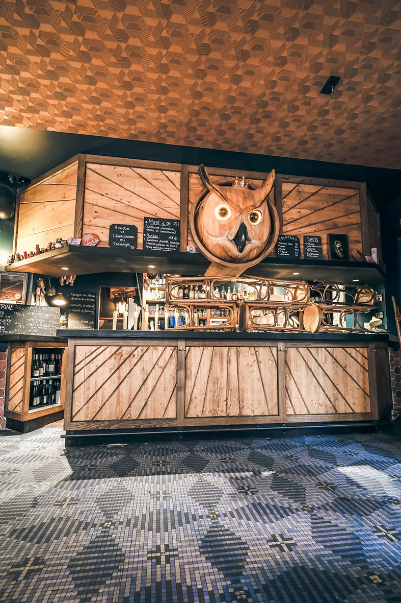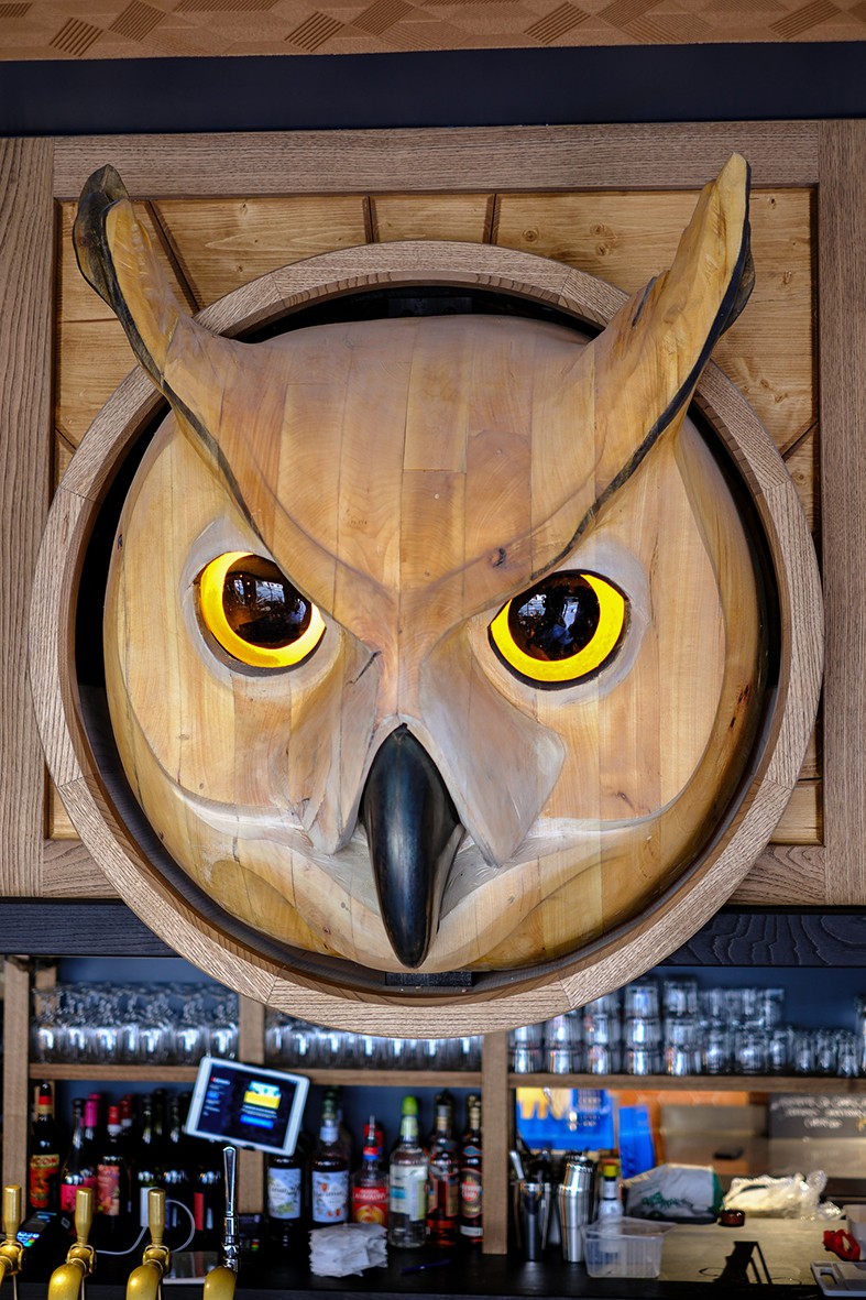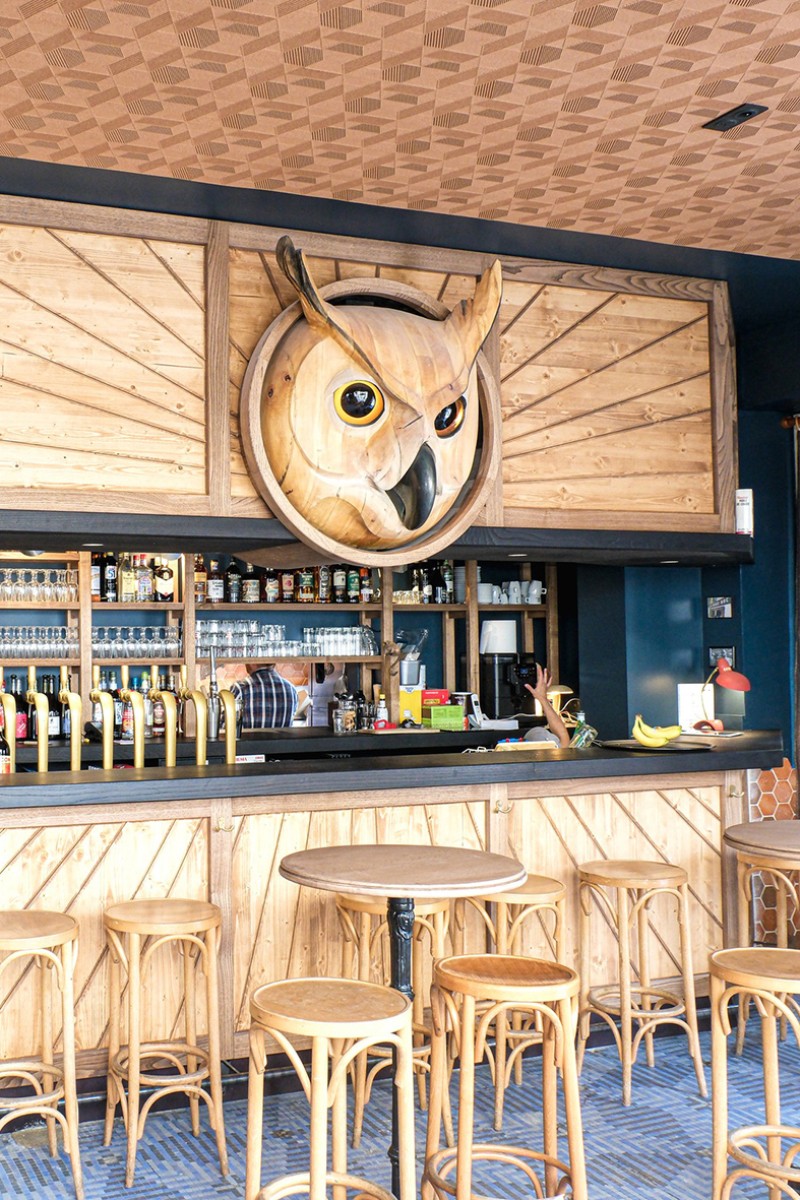 Le fronton prend la forme d’une tête de hibou monumentale. Tilleul sculpté, yeux en verre soufflé, bec en tôle repoussée : plusieurs savoir-faire dialoguent dans une écriture unifiée. Le châtaignier, brossé puis huilé de la piste, révèle la matière et ancre l’ensemble dans une matérialité chaleureuse et durable.