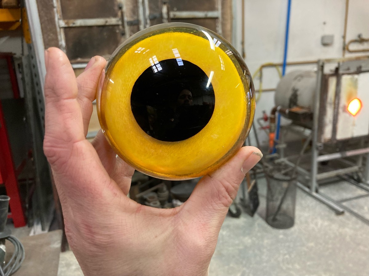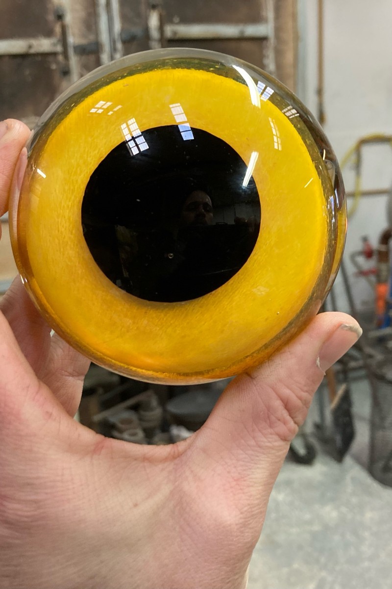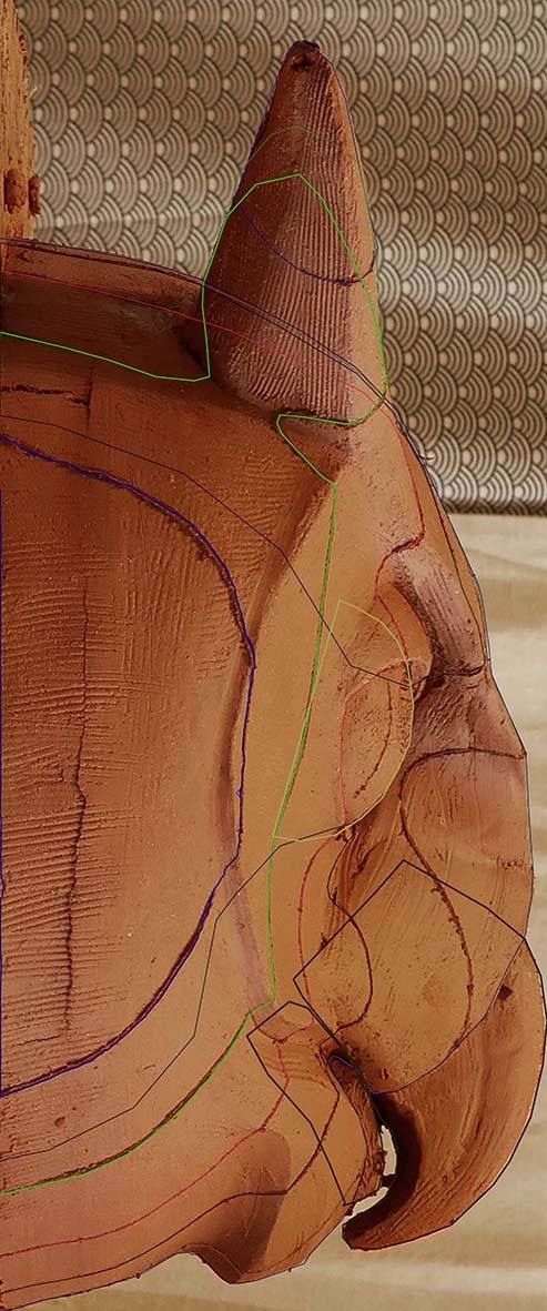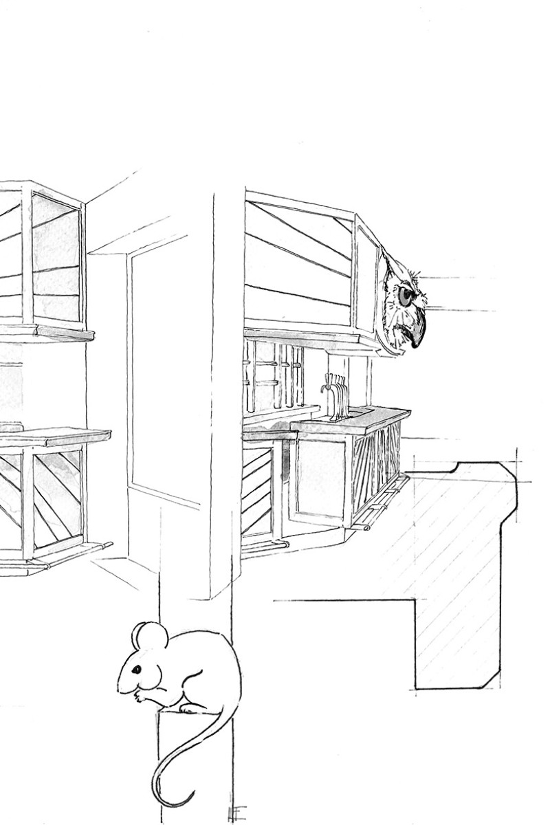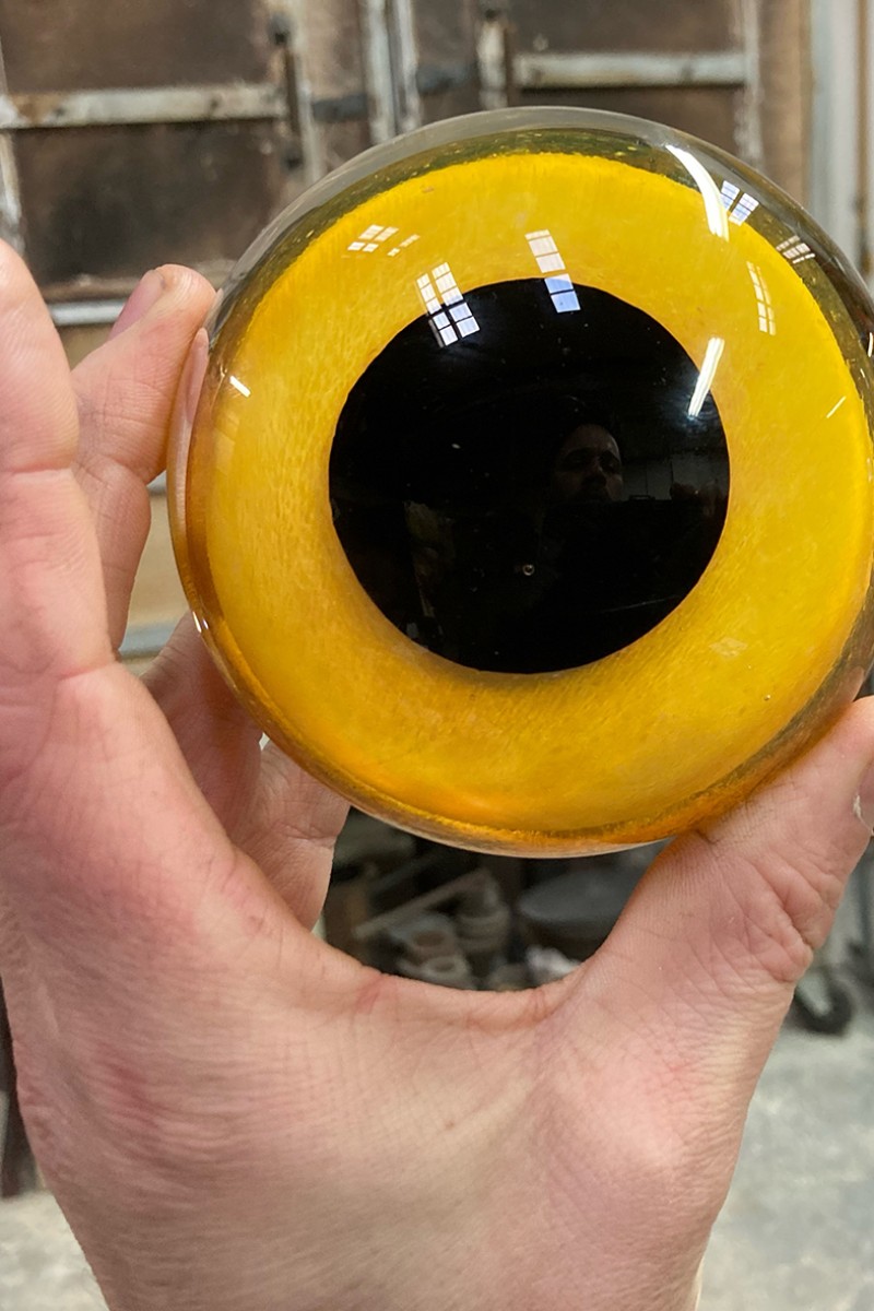 Le fronton prend la forme d’une tête de hibou monumentale. Tilleul sculpté, yeux en verre soufflé, bec en tôle repoussée : plusieurs savoir-faire dialoguent dans une écriture unifiée. Le châtaignier, brossé puis huilé de la piste, révèle la matière et ancre l’ensemble dans une matérialité chaleureuse et durable.