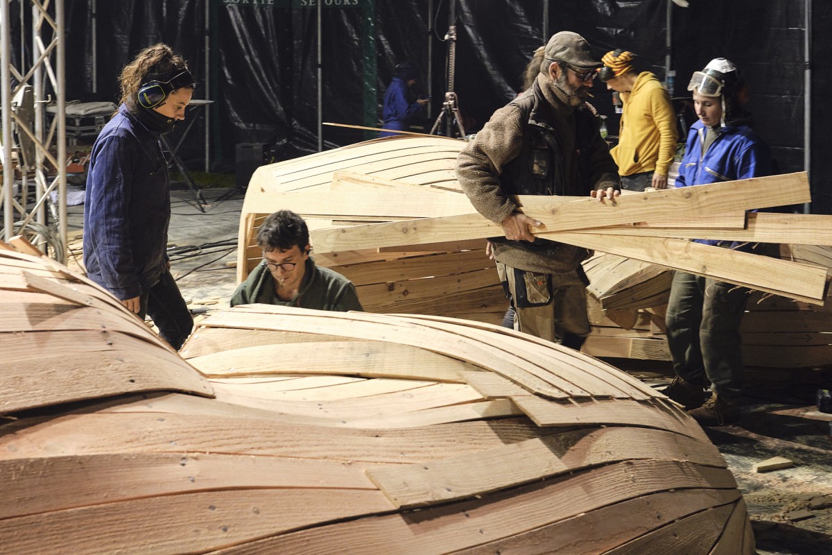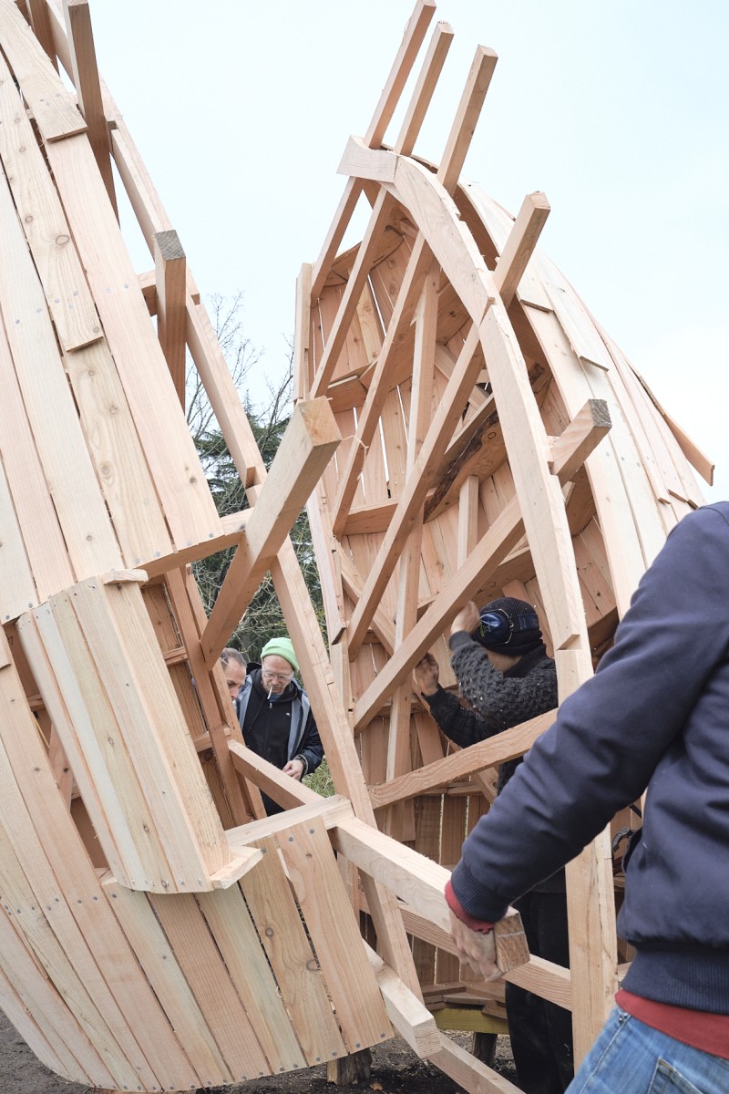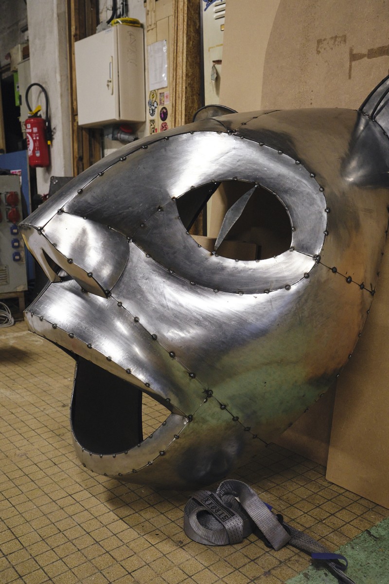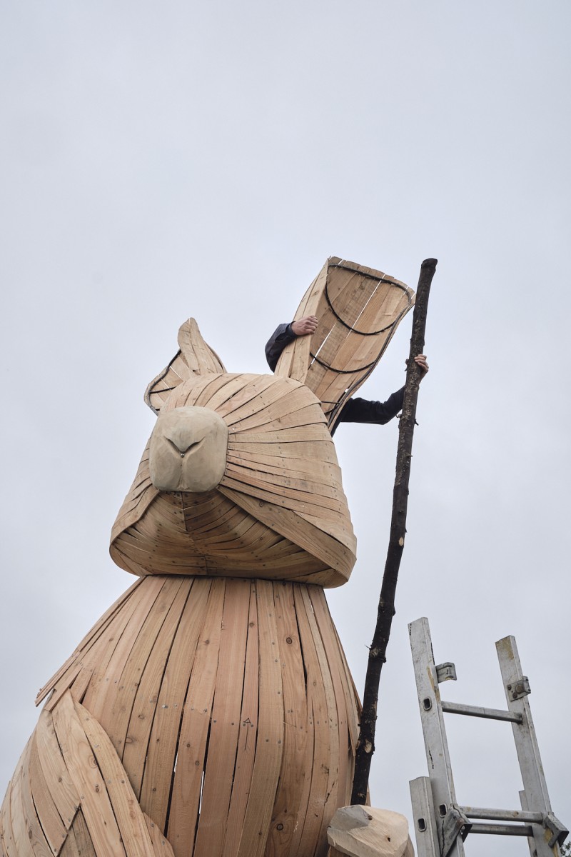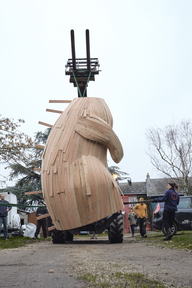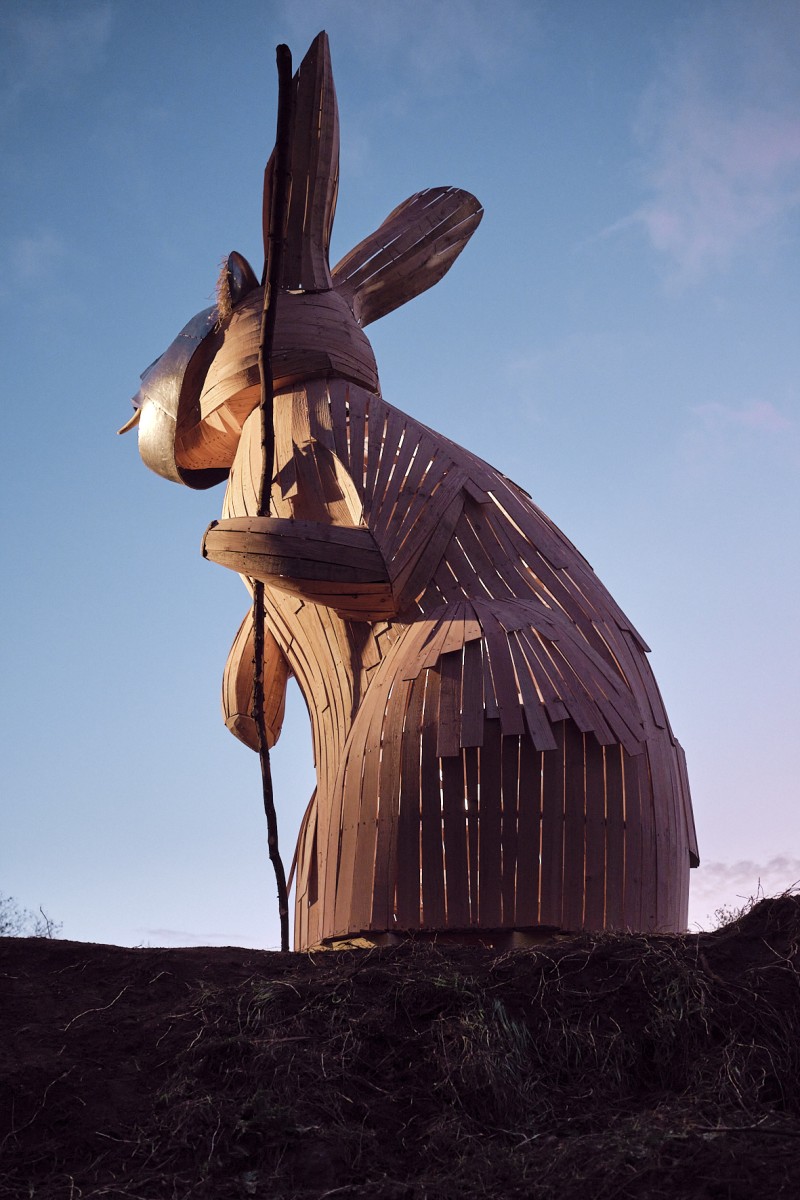 L’enjeu de ce projet était de concevoir et réaliser une sculpture qui puisse rassembler des techniques de construction de grands volumes en bois et métal, être un support pédagogique et raconter un lieu. La figure du lapin à masque de jaguar n’est pas apparue tout de suite, mais après une visite approfondie du site de formation, Quai Des Chaps, lieu adossé au périphérique nantais, avec ses grands talus artificiels, l’idée a germé. Pour nous, le lapin représente bien les habitants d’une lisière péri-urbaine en devenir : il est anonyme, commun, vulnérable. Construire un lapin géant avec 12 stagiaires motivés, c’est déployer beaucoup d’énergie pour célébrer le « pas grand-chose », l’inutile essentiel que l’on retrouve dans chaque geste artistique. Avec un masque de jaguar comme attribut, nous voulions en faire une figure protectrice de ce lieu. Au Mexique, le Jaguar navigue entre les mondes visibles et invisibles à l’image de Quai Des Chaps, lieu de création qui joue ce rôle de passeur entre la fabrique du spectacle et sa présentation au public.