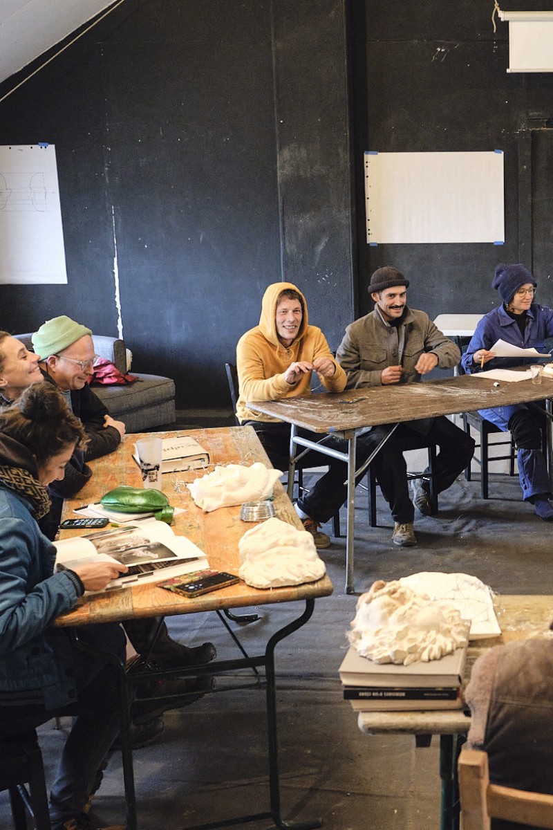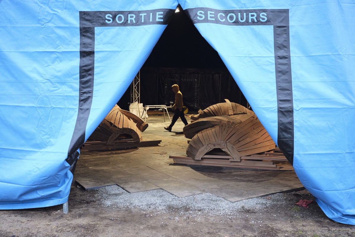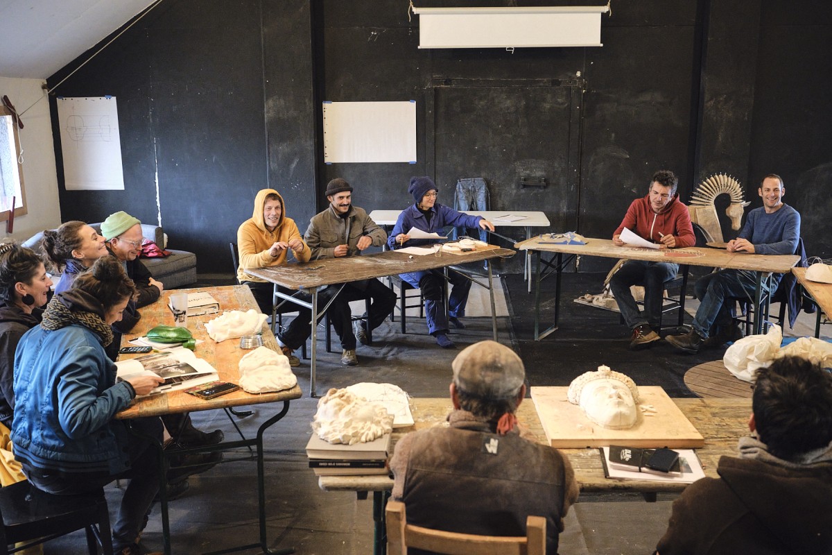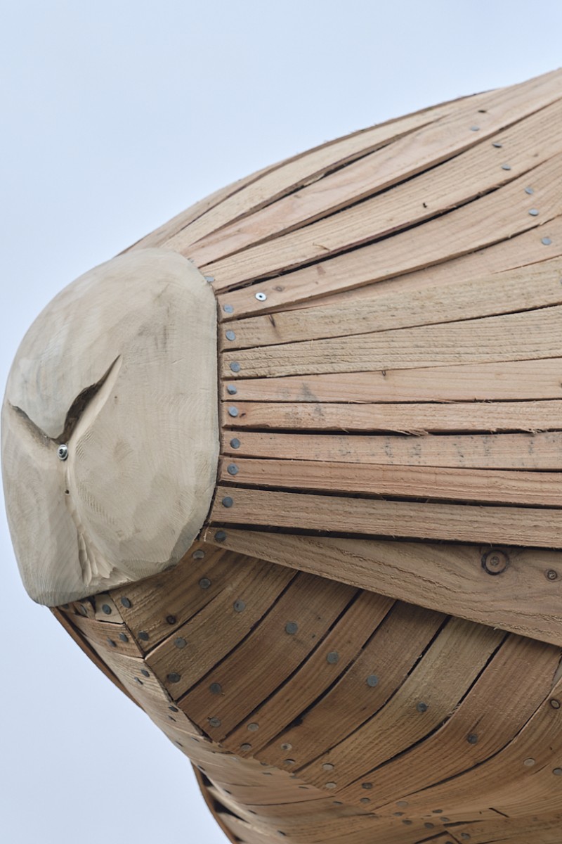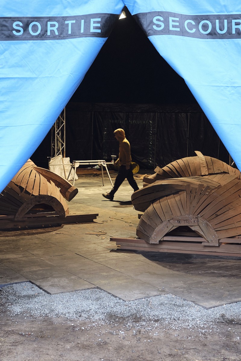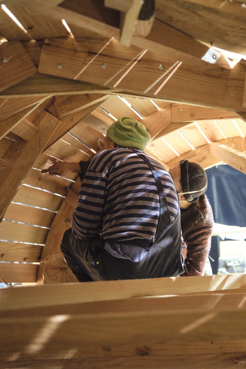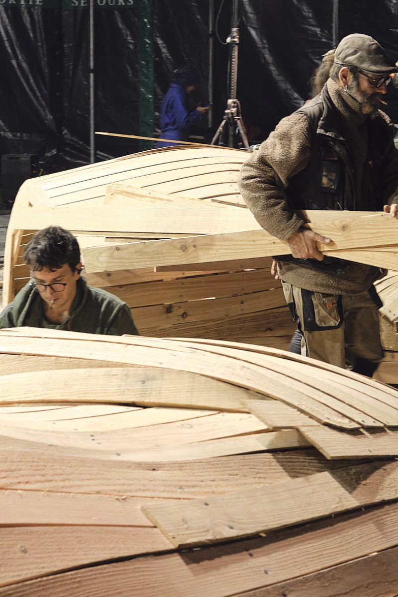 L’enjeu de ce projet était de concevoir et réaliser une sculpture qui puisse rassembler des techniques de construction de grands volumes en bois et métal, être un support pédagogique et raconter un lieu. La figure du lapin à masque de jaguar n’est pas apparue tout de suite, mais après une visite approfondie du site de formation, Quai Des Chaps, lieu adossé au périphérique nantais, avec ses grands talus artificiels, l’idée a germé. Pour nous, le lapin représente bien les habitants d’une lisière péri-urbaine en devenir : il est anonyme, commun, vulnérable. Construire un lapin géant avec 12 stagiaires motivés, c’est déployer beaucoup d’énergie pour célébrer le « pas grand-chose », l’inutile essentiel que l’on retrouve dans chaque geste artistique. Avec un masque de jaguar comme attribut, nous voulions en faire une figure protectrice de ce lieu. Au Mexique, le Jaguar navigue entre les mondes visibles et invisibles à l’image de Quai Des Chaps, lieu de création qui joue ce rôle de passeur entre la fabrique du spectacle et sa présentation au public.