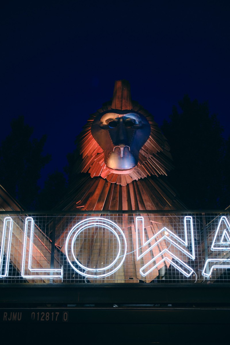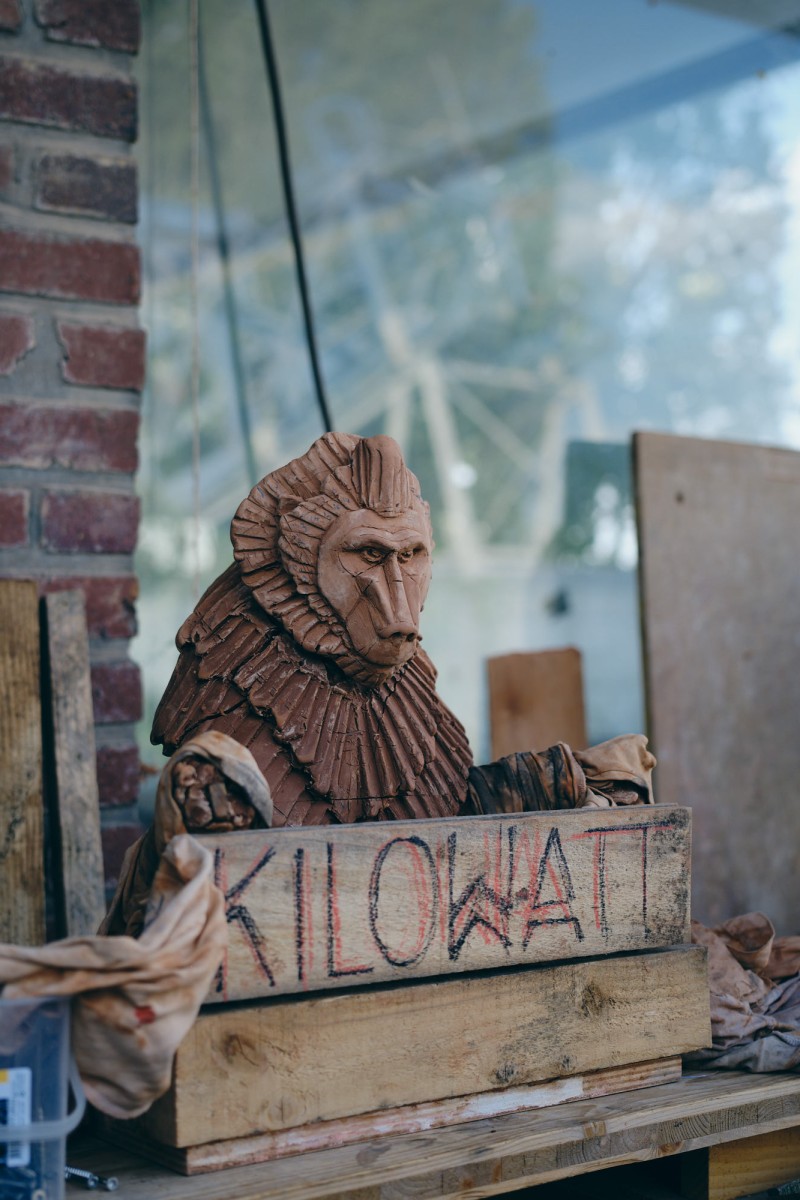 Construit en 3 semaines, c’est la première sculpture où MONsTR mixe une technique de bardage bois pour la fourrure de l’animal et de mise en forme de tôle pour la partie peau (masque du visage et mains). Elle s’inspire du Drill, un singe qui semble porter un masque.