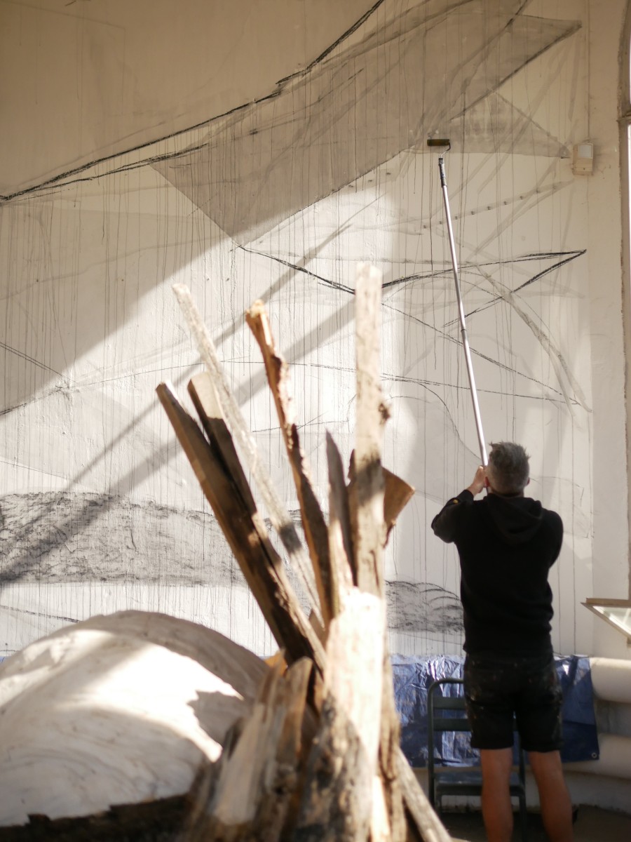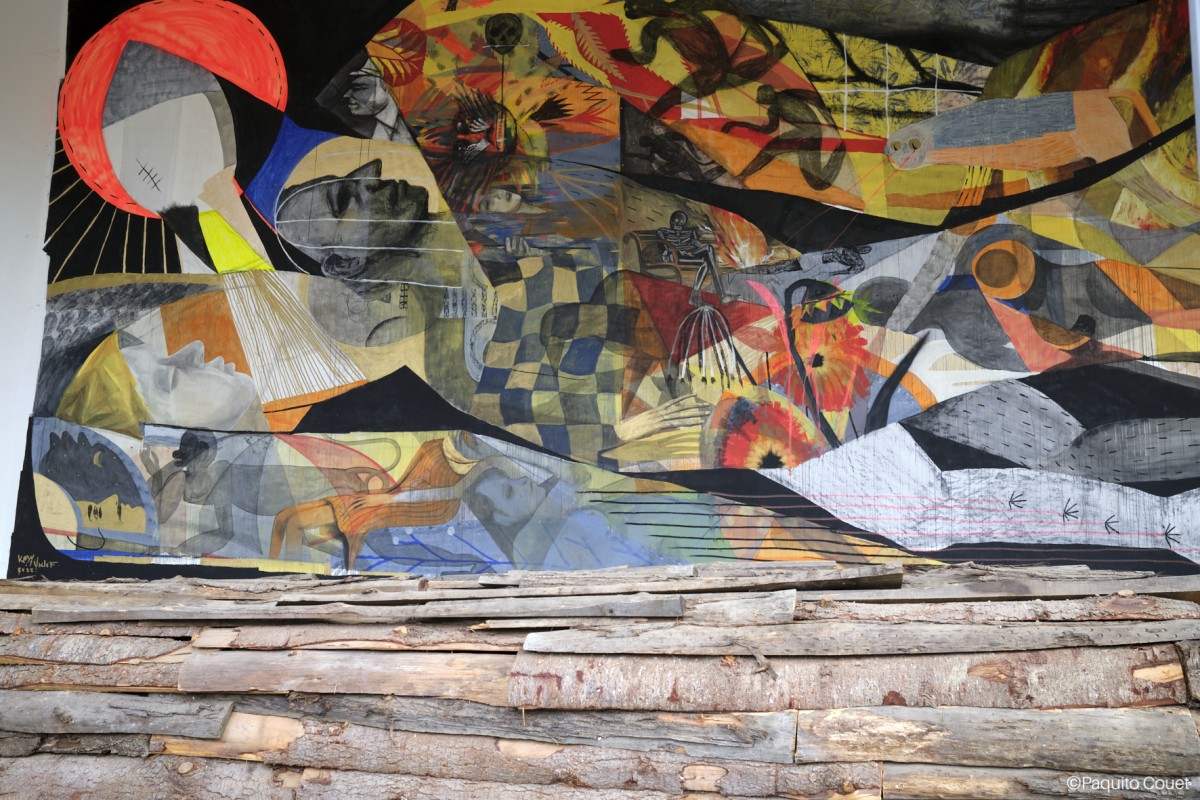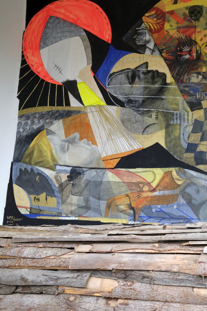 Autour et à partir de ce volume, la fresque de Kazy s’installe. Elle ne vient ni illustrer ni décorer la sculpture, mais l’accompagner, l’élargir, en ouvrir les lectures. Les formes peintes reprennent certaines lignes tout en développant leur propre langage. Les deux pratiques dialoguent ainsi dans un équilibre précis : distinctes dans leurs moyens, liées dans leur intention.