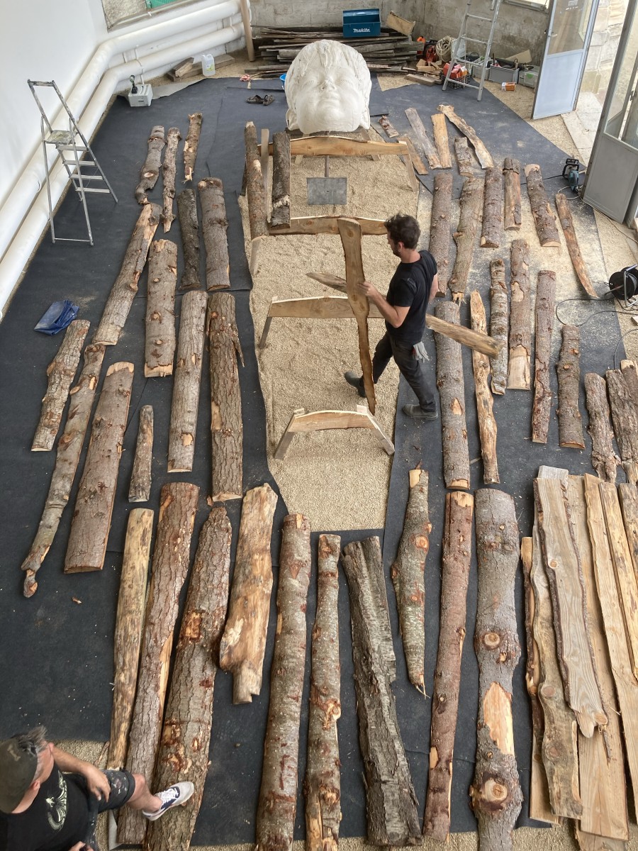 De cette invitation naît une œuvre immersive conçue à deux voix. MONsTR réalise une sculpture monumentale, pensée comme un point d’ancrage physique et symbolique dans l’espace. Le bois, laissé volontairement lisible, renvoie directement à la forêt, à sa matière, à sa vulnérabilité autant qu’à sa résistance. La sculpture accueille le public dès l’entrée et pose le cadre du récit.