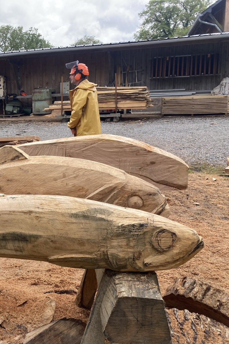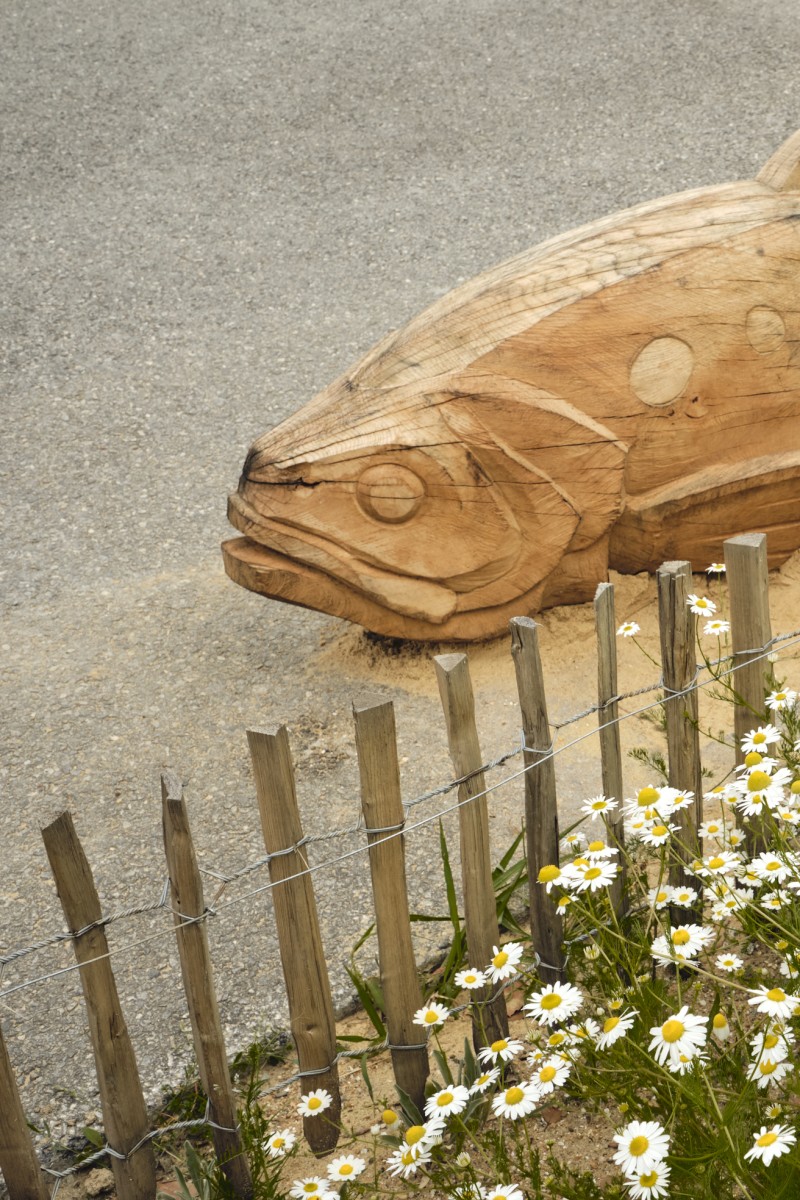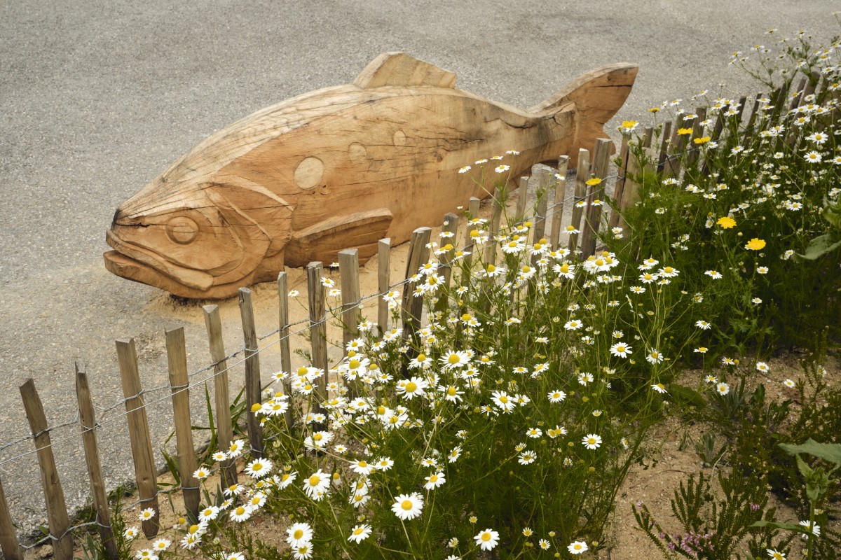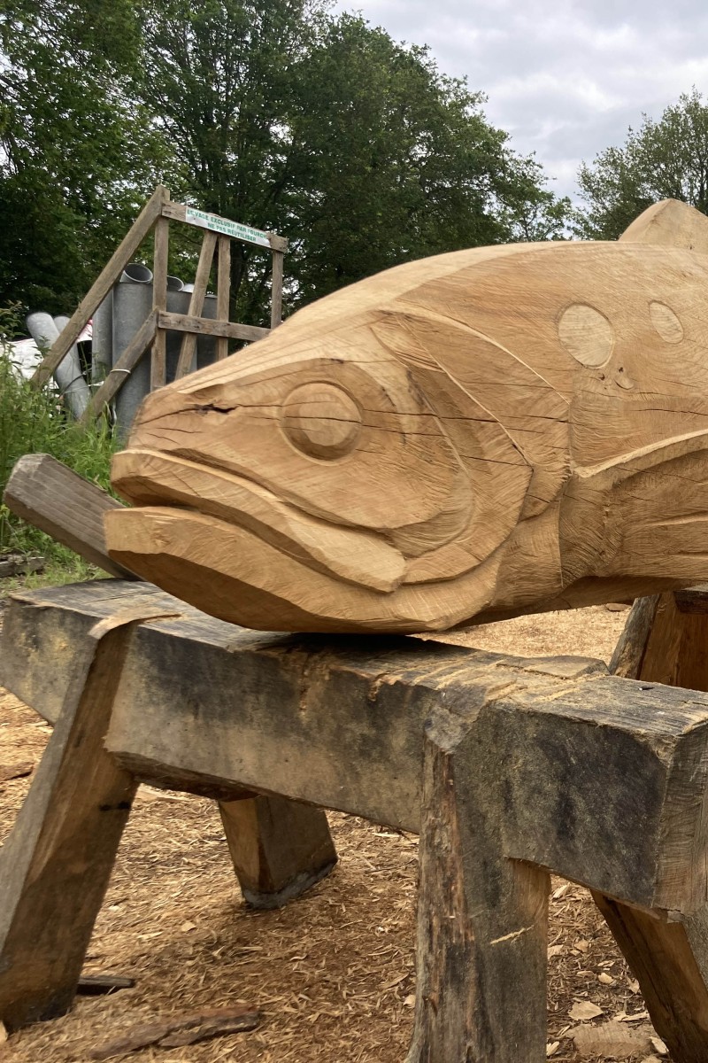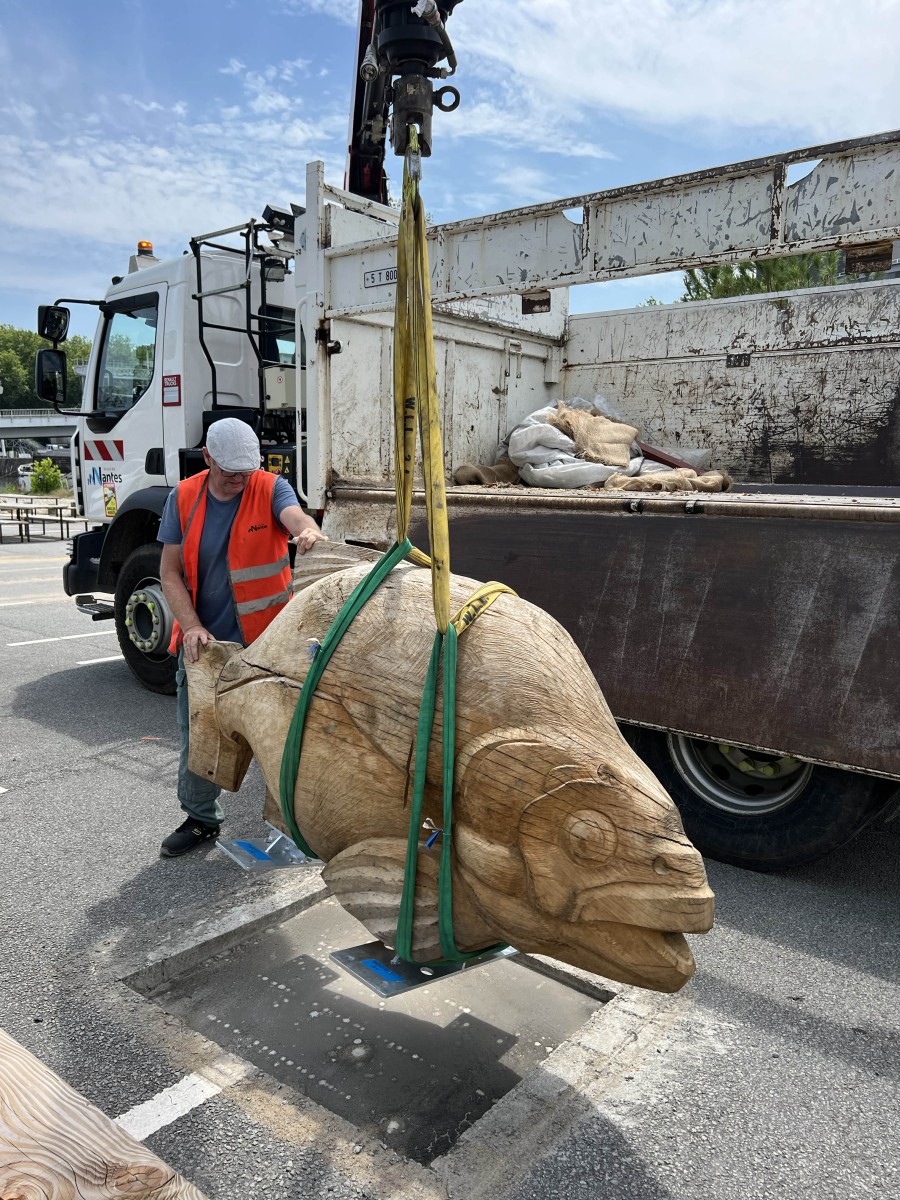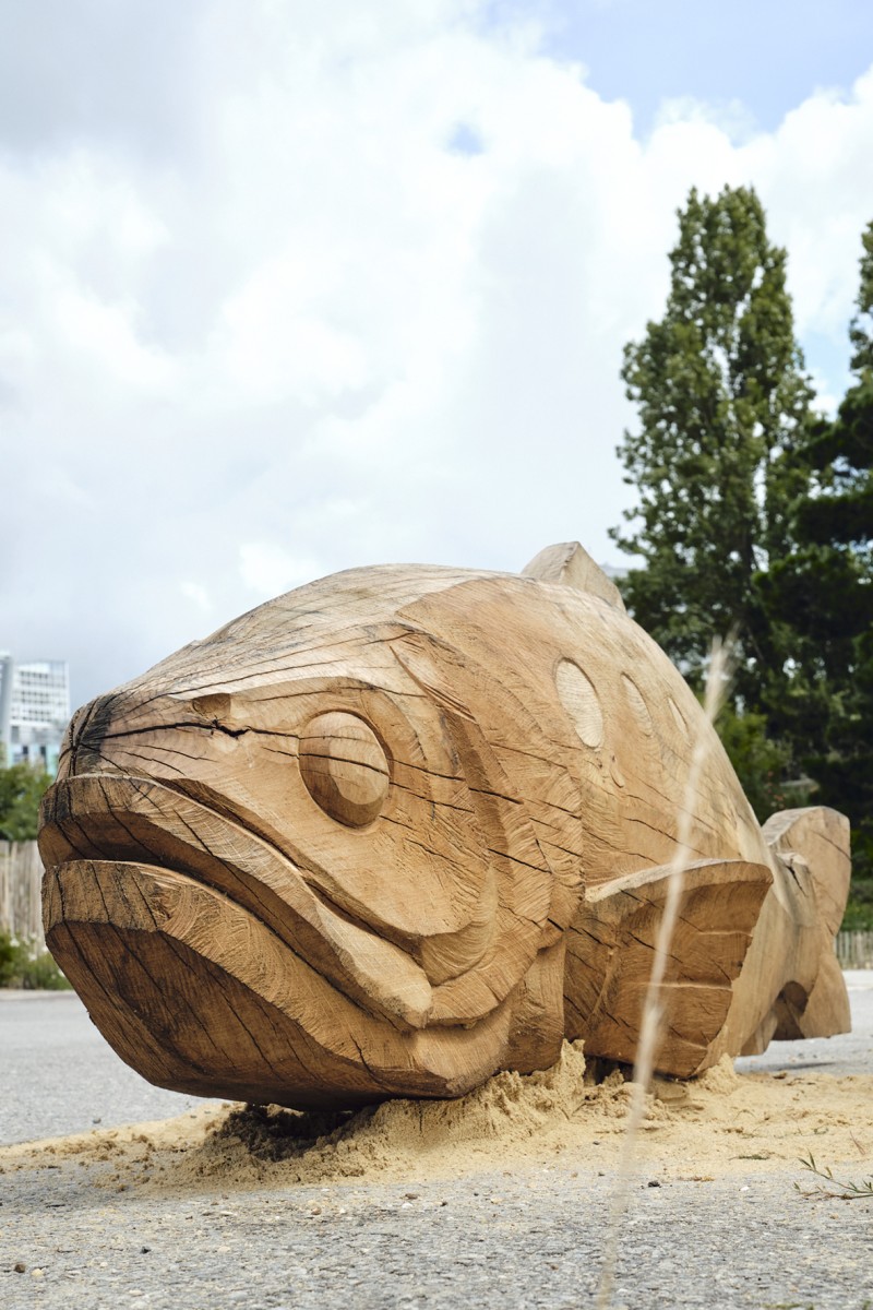 Pour répondre à cette intention, nous avons dessiné et sculpté cinq poissons emblématiques de la Loire, sandres, alose, éperlan, anguille et brème, choisis pour la force graphique de leurs silhouettes autant que pour leur ancrage dans l’écosystème ligérien. Réalisées en bois nantais, fourni par les services techniques municipaux, ces sculptures assument pleinement une matérialité vivante et évolutive : le bois est destiné à se transformer avec le temps, à se patiner, et potentiellement à être colonisé par d’autres formes de vie.
