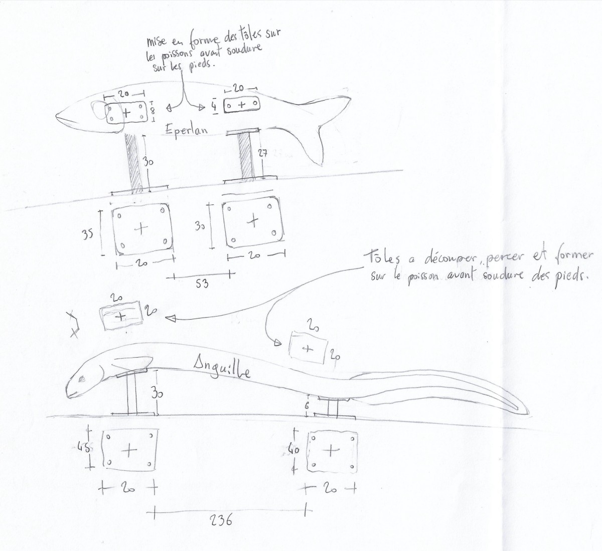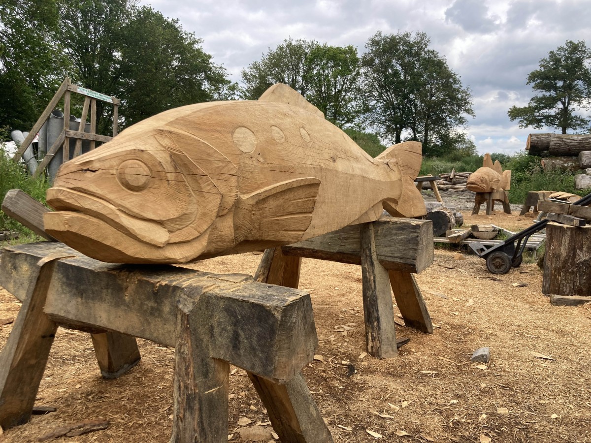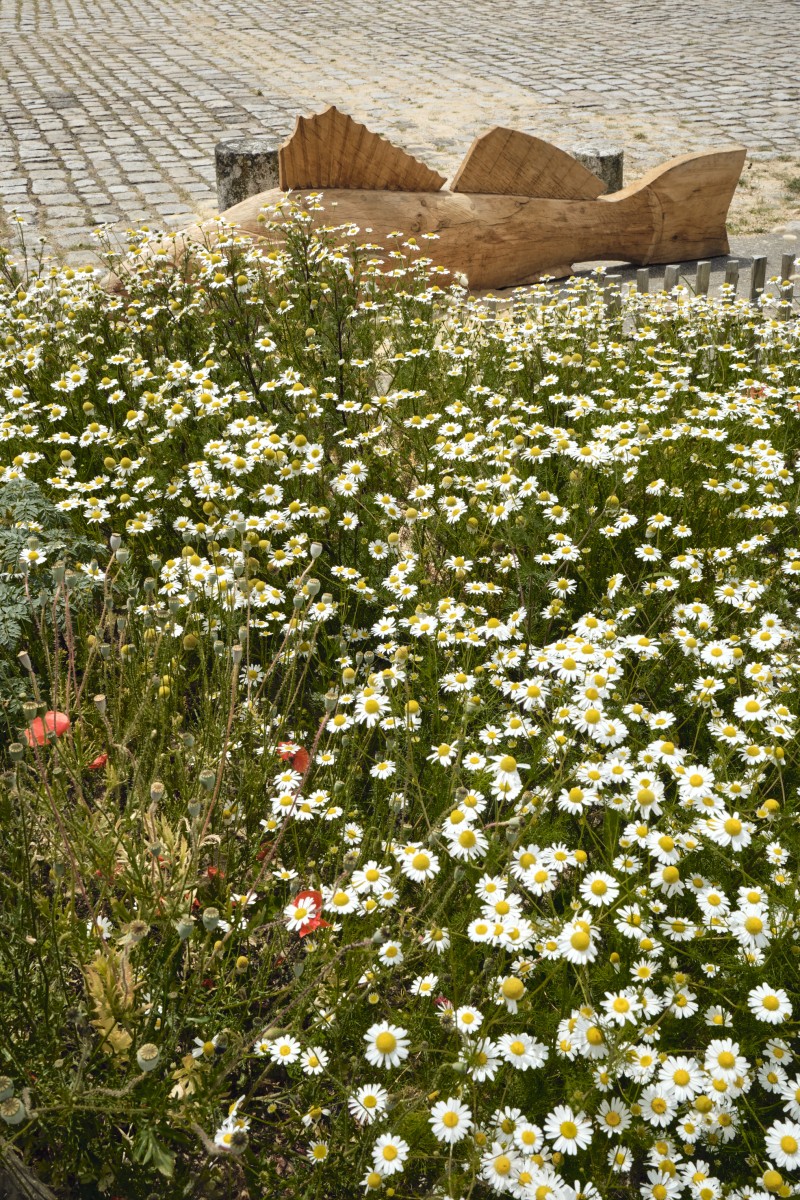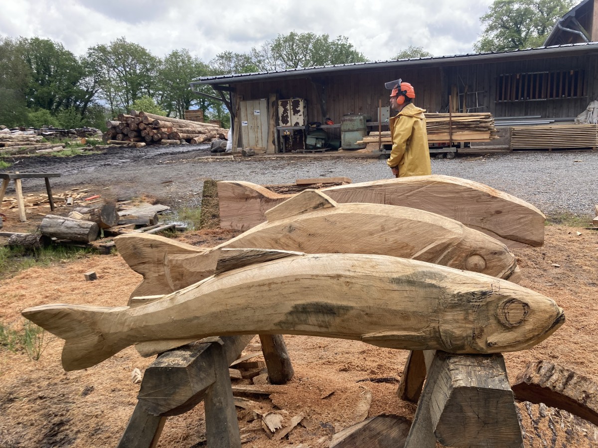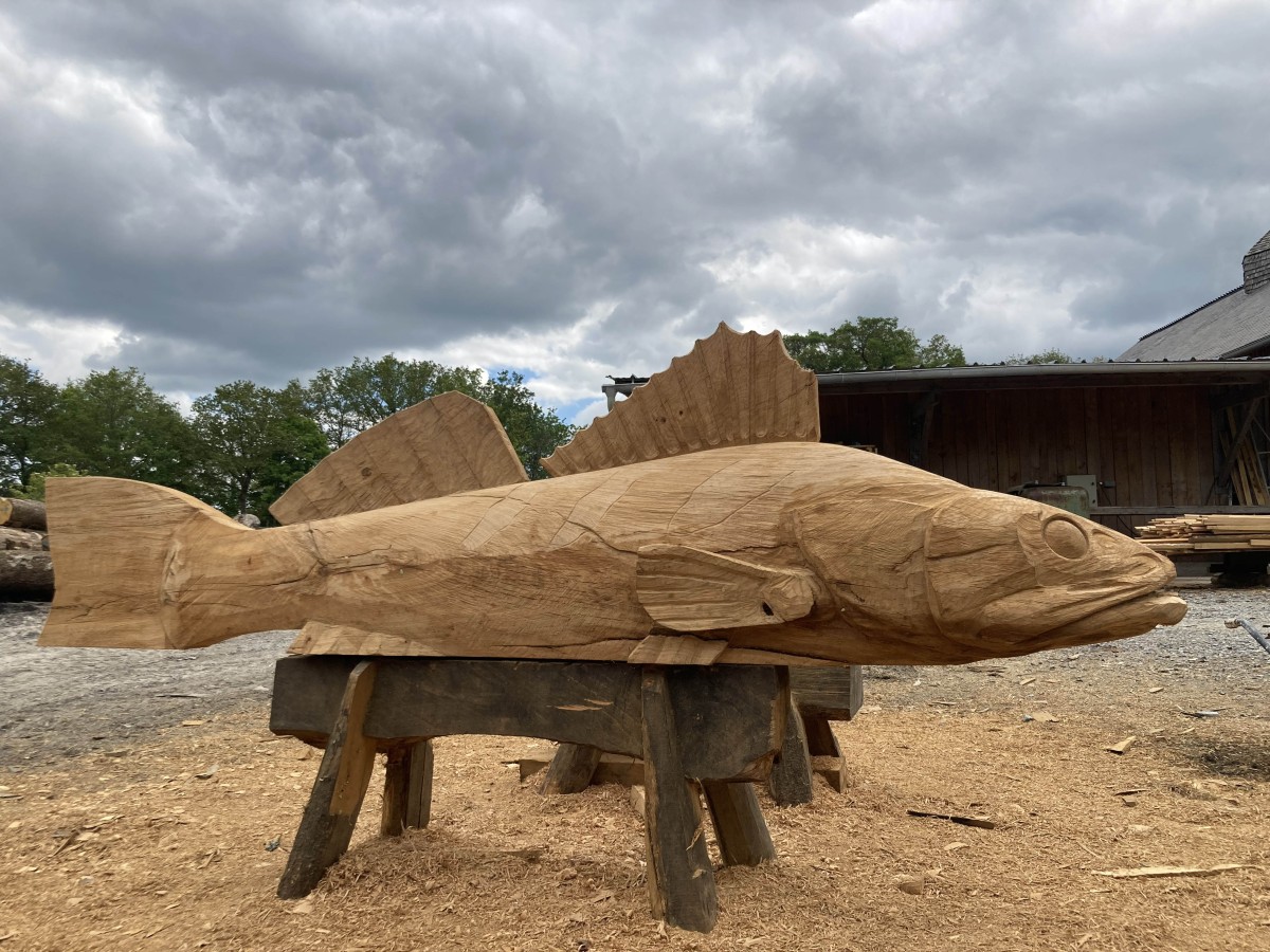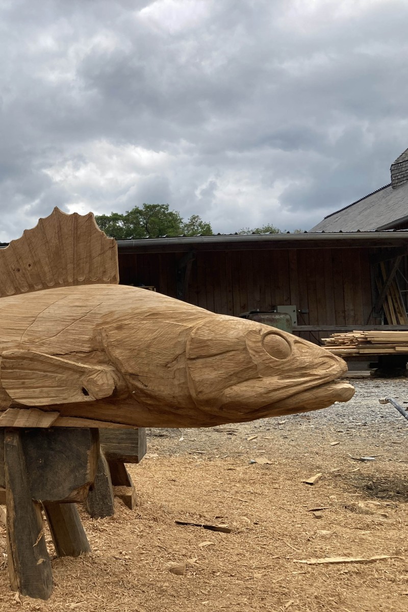 Pour répondre à cette intention, nous avons dessiné et sculpté cinq poissons emblématiques de la Loire, sandres, alose, éperlan, anguille et brème, choisis pour la force graphique de leurs silhouettes autant que pour leur ancrage dans l’écosystème ligérien. Réalisées en bois nantais, fourni par les services techniques municipaux, ces sculptures assument pleinement une matérialité vivante et évolutive : le bois est destiné à se transformer avec le temps, à se patiner, et potentiellement à être colonisé par d’autres formes de vie.